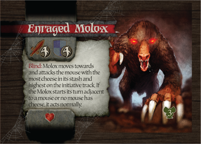 Cependant, quand un molox est blessé, sa figurine reste sur le plateau. Seul la carte initiative du dessus est retirée et notre grosse bèbète devient fachée. La tactique du Molox ne change pas, mais son attaque et sa défense s'améliore. Il sera important de partager les morceaux de fromage en vos souris. Après tout, peu de rôdeurs peuvent prendre un sacré coup sans finir par être capturés.