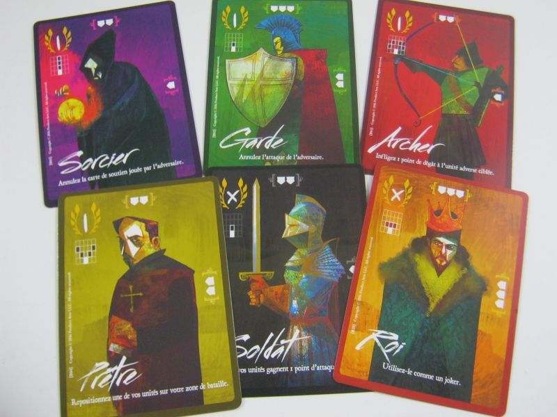 Le roi, que chaque joueur possède en un seul exemplaire sert de joker. Le sorcier annule la carte soutien jouée par l'adversaire, qui sont aussi des unités. Le prêtre quant à lui permet de repositionner une de vos unités sur votre zone de bataille. Le soldat octroie un point d'attaque en plus ce tour-ci. Le garde annule l'attaque adverse, et enfin l'archer inflige 1 point de dégât à l'unité adverse ciblée.