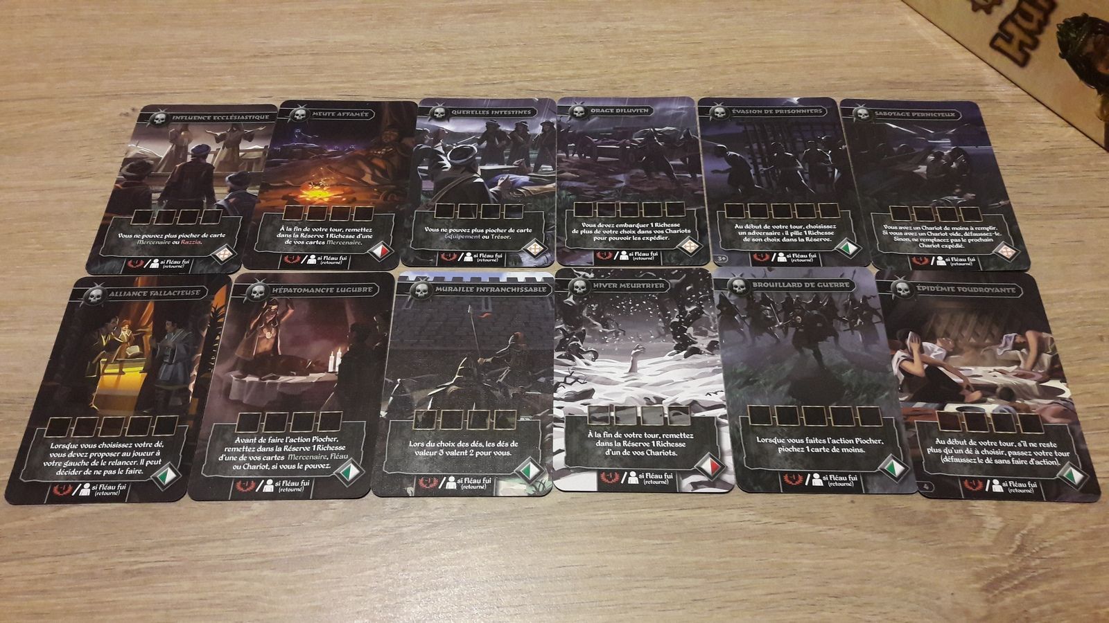Vous devrez pillez ces ressources pour remplir vos chariots, payer la solde de vos mercenaires (cartes vertes) ou pour vous débarrasser des fléaux (cartes noires).