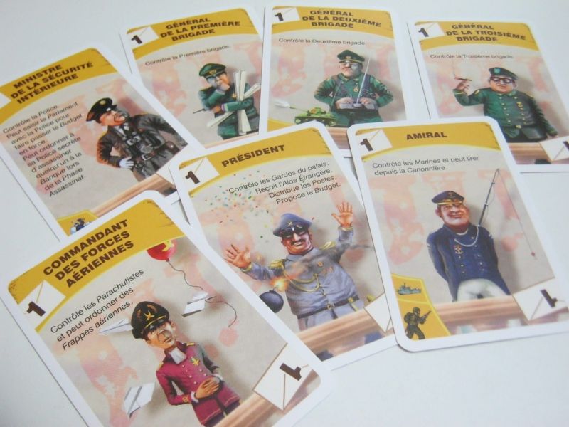 Chaque joueur occupe un poste parmi les suivants : président, le ministre de la Sécurité intérieure, le général de la première brigade, le général de la deuxième brigade, le général de la troisième brigade, l'amiral de la Navy et enfin le commandant des forces aériennes. Une fois le président désigné c'est à lui qu'incombe la tâche de constituer son cabinet. Vous l'aurez compris la République de Las Bananas est gouvernée d'une main de fer. Si les deux premiers rôles disposent de certains pouvoirs, les autres contrôlent leurs factions militaires respectives.