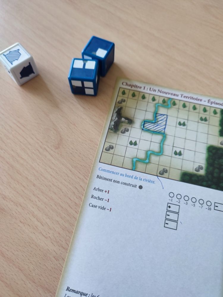 Dans cette petite boite, il n'y a aucune enveloppe : le scoring est inscrit directement sur les fiches et tous les épisodes sont expliqués dans le livret de règles avec ce qui va arriver (il n'y aura pas d'effet de surprise). L'utlisation de dés à la place des cartes permet aussi de desiner plusieurs fois la même figure sans forcément savoir ce qui va venir au prochain lancé contrairement à My City où on voyait au fur et à mesure les formes de polyominos qui restaient à jouer et où surtout on pouvait anticiper leur placement... ou pas !