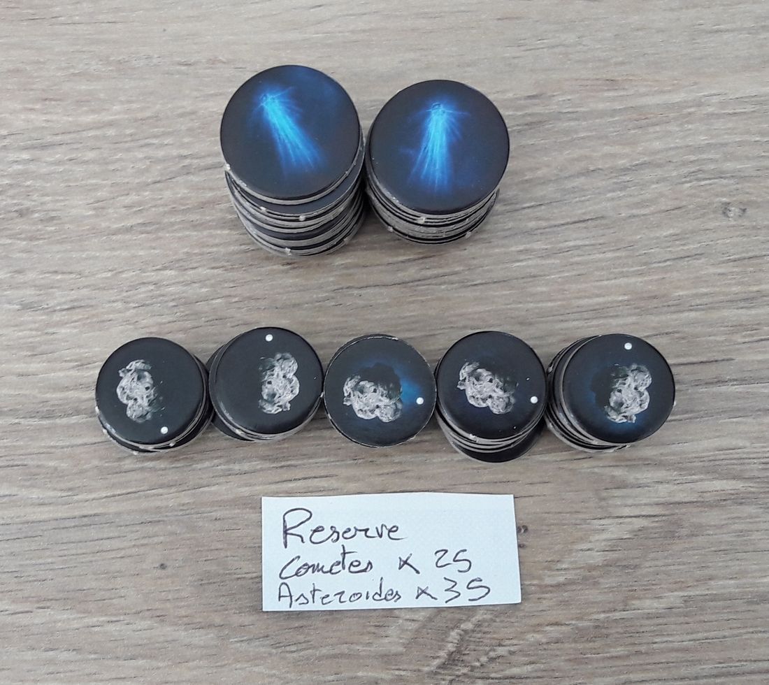 Mais ils peuvent être surtout utilisés pour créer la vie, suite à des collisions ils font croître vos planètes telluriques, dépenser 2 astéroïdes vous donnera une comète et dépenser un astéroïde vous donnera l'accès à l'extension de plateau de votre système.