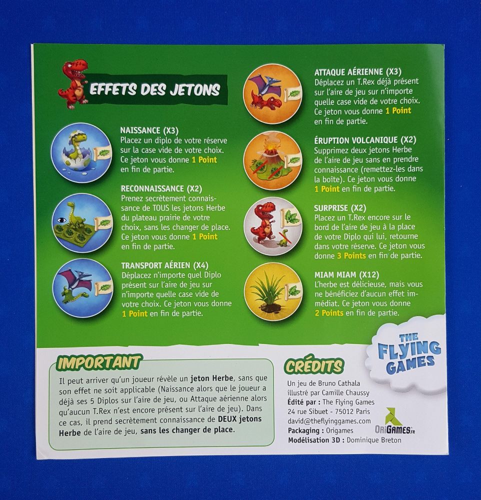 Les effets des jetons sont tous expliqués sur la dernière page de la règle : de la naissance de Diplo, à l'arrivée d'un T.Rex, au transport aérien de Diplo, à l'attaque aérienne de T.Rex, à l'herbe verte qui vaut 2 points... Les illustrations et l'iconographie sur les différents jetons se suffisent à eux même dès la première partie pour ne pas avoir à retourner sans cesse dans la règle du jeu.