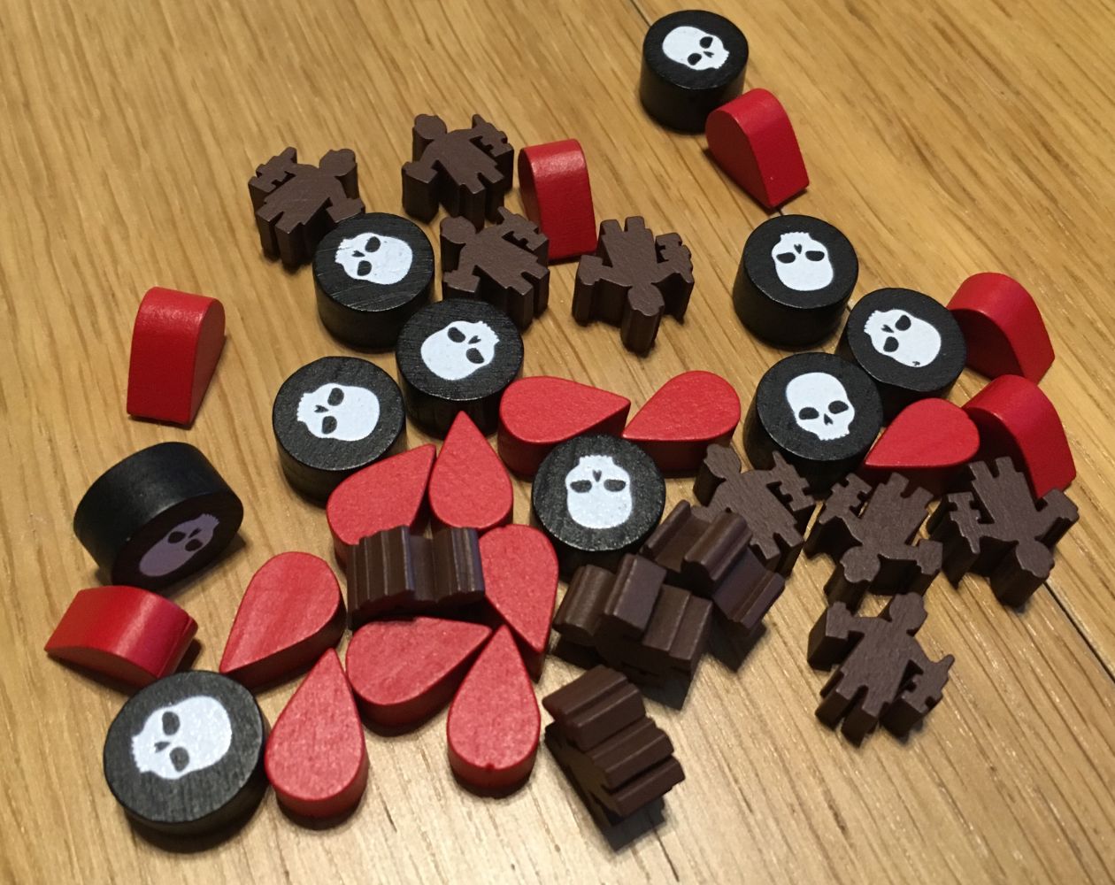 On a donc de nouveaux meeples pour les nouveaux spécialistes, des jetons goutte de sang pour remplacer les tokens de poches de sang et des jetons avec une tête de mort pour remplacer les tokens en carton des morts.