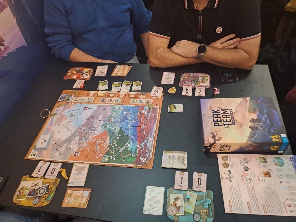 On se retrouve tous les 4 sur le stand de Matagot pour tenter de jouer à The Peak Team.