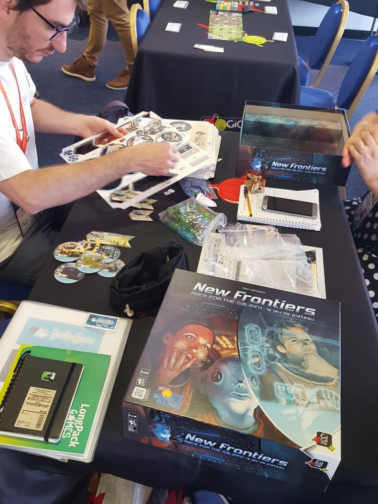 New Frontier, je veux toutes les infos, un compte rendu complet :) On avait regardé à sa sortie en anglais, mais ça donnait l'impression d'être simplement Race for the Galaxy avec des tuiles qui remplace les cartes. Autant Roll à son petit twist qui fait que le jeu est tout à fait différent et pas redondant, autant là, on a pas vu l'intérêt... donc je veux savoir pourquoi les étoiles brillent dans les yeux de Nico :)