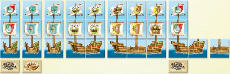 Vous avez à votre disposition différents morceaux de coques afin de construire des bateaux de tailles 1, 2, 3 ou 4. Chaque coque devra avoir un mat et une voile. Donc, un bateau de taille 3 aura une coque "avant", une coque "milieu", une coque "arrière", 3 mats et 3 voiles. Sachant que tous les mats et les voiles doivent contenir le même symbole. La seule exception est le symbole couronne qui est un joker et peut donc remplacer n'importe quel symbole (mais il ne peut pas être acheté de base, faut pas rêver).