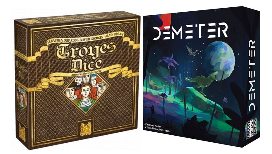 Pour finir deux jeux. C'est du Roll and write mais c'est clairement pour des joueurs avertis. Déclenchement de combos, beaucoup de stratégie mais vous devrez choisir la vôtre. Dans Troyes Dice vous devrez trouver votre stratégie tout en vous protégeant au mieux contre les attaques du dé noir. Dans Demeter vous devrez créer puis observer des dinosaures le mieux possible.