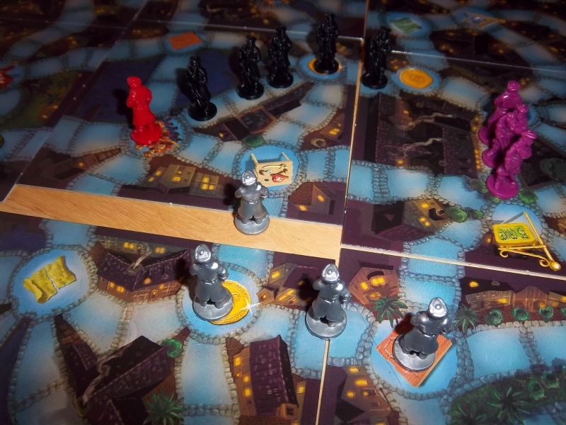 La mécanique de base est simple : c'est du placement en file indienne de figurines sur des cases de rue (le capitaine envoie ses gars en éclaireur si vous voulez) et lorsque vous déplacez le capitaine en tête de Colonne sur un endroit précis, vous pourrez effectuer une action. Et des actions, il y en a pas mal (oui, c'est Bien un Feld). Alors, on peut faire quoi dans cette ville ?