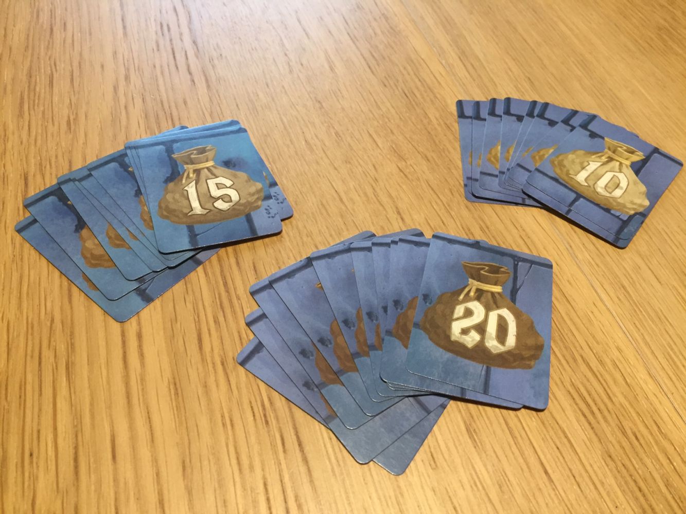 Il y a donc bien cinq setup joueurs, avec des cartes, un petit token hache et trois nuages en carton.