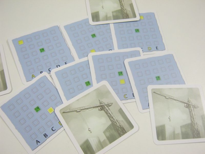 On retrouve dans la boite des cartes Préparation qui vont servir à initier le jeu, en disposant des pièces neutres. On trouvera également des cartes Gratte-ciel, à raison d'une par joueur et qui serviront d'objectif à atteindre pour chaque, en tentant d'ériger le plus haut immeuble dans la zone désignée par la carte. Enfin, on retrouvera des cartes Plan, 5 par joueur, jouables dans la version avancée du jeu, et qui octroieront des points supplémentaires si vous avez parié sur les bonnes cartes et que vous êtes parvenus à construire les bâtiments désignés.