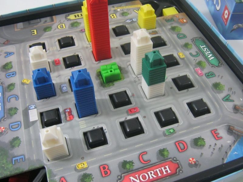 Autre élément qui va venir s'enficher dans ces picots : le plateau. Celui-ci représente les différentes rues de la ville, et donne surtout une indication sur la disposition de celles-ci à l'aide des 4 points cardinaux (en anglais) de couleurs différentes. Chaque joueur devant, dans la mesure du possible, se placer face à sa couleur. De plus, vous retrouverez sur ce plateau et en face de chaque joueur, une lettre allant de A à E pour chaque colonne. Qui seront très importantes dans le jeu pour placer les premières places neutres et réussir les objectifs.