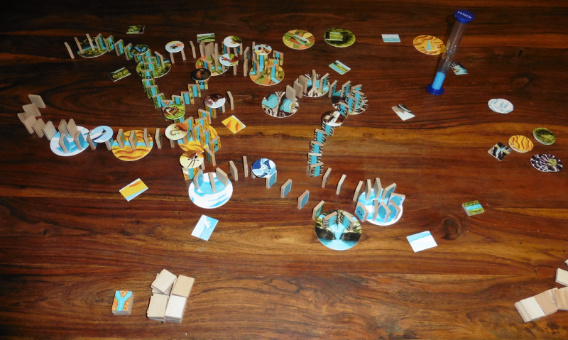 Première partie de découverte à 2 joueurs et pas mal de prises de risques, mais aussi pas mal d'échecs et de relance nécessaire à faire tomber tous les dominos, mais aussi des animaux qui tombent sur les tuiles...