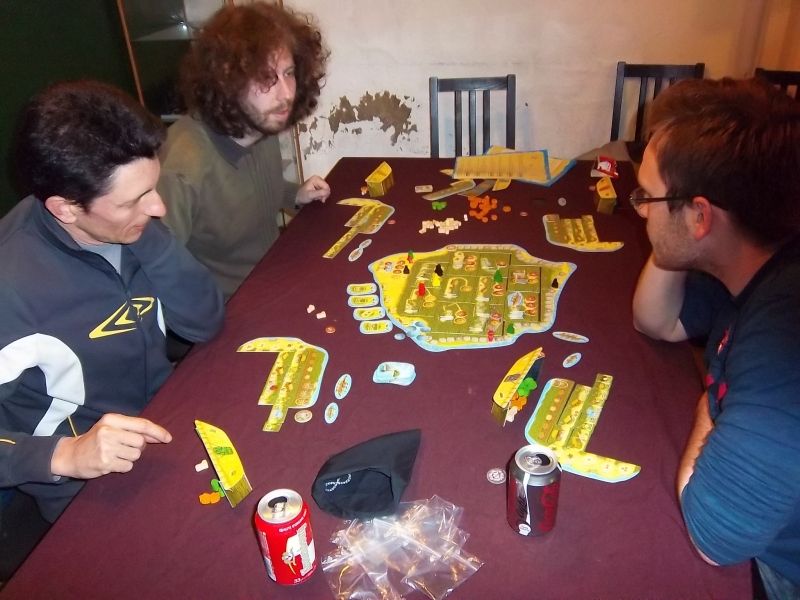 Monsieur Thomas va construire 2 villages, dont un très long. Les autres joueurs vont faire des choses plus "ramassées". Monsieur Nico a souvent joué les îles me semble-t-il. J'ai joué surtout sur les points de première place et pour cela, la pêche allait souvent me donner le coup de pouce nécessaire...(ce qui est souvent le cas quand on manque de coquillage et de fruit), et puis un surfer à -4 m'aidait a entrer dans les points.