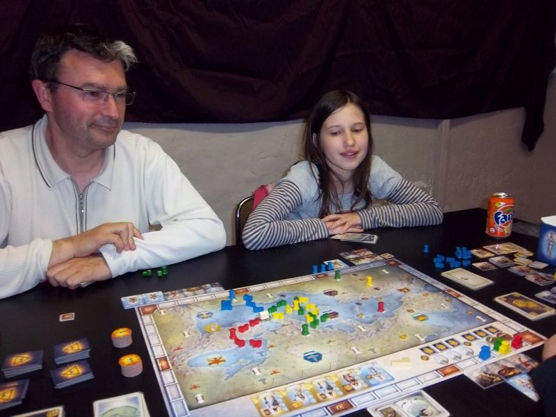 Mardi soir, 4 joueurs se sont penchés sur le cas de Panthéon, jeu apporté par Lilajax. Cormyr et moi avons écouté avec attention les règles, un brin intimidés par la présence à notre table de la toute jeune mademoiselle Lila qui connaît déjà bon nombre de jeux que nous pratiquons régulièrement. Et ben oui, avoir un papa joueur (et expliqueur de règles), c’est quand même un avantage. Et évidemment, elle avait déjà joué à Panthéon.
