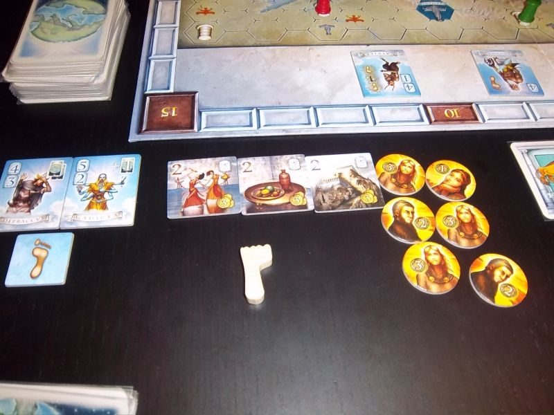 Bref, ce moment de rigolade passé, nous voilà embarqué dans cette histoire de Panthéon. On commence tous avec un petit "pouvoir" différent (donné au hasard). Il faut "séduire" des Dieux pour se les mettre dans la poche, construire des colonnes sur des emplacements prévus à cet effets, gérer une main de carte, poser des « traces de pieds » sur le plateau, et acheter des tuiles pour attirer les Dieux plus facilement. Parce que mine de rien, pèlerinages, temples, offrandes et tutti quanti, ça coute cher, et l’argent fut d’ailleurs mon principal problème pendant la partie. Mademoiselle Lila a pris un bon départ, avec assez d’argent pour rafler pas mal de dieux, mais au décompte final, elle avait peu de point sur le plateau. Ce fut plutôt le contraire pour moi : les points de demi-dieux accumulés patiemment me permettent de faire une belle remonté sur la piste des scores, alors qu’au trois-quarts de la partie j’étais encore un bon et solide dernier.