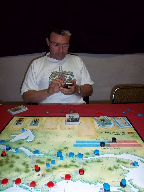 Ayant pris le camp anglais, j’ai mis un certain temps à comprendre pourquoi j’avais tant de mal à progresser. N’ayant que la moitié des règles en tête, il me manquait toujours un truc pour faire quelque chose, genre « Ah oui, mais là, il te faut un bateau », « Non, il faut un colon pour t’installer à Albany », « Ah d’accord, mais là, si tu poses pas l’artillerie tout de suite, tu perds le siège automatiquement », « Heu…tu peux pas faire de raid avec les natives car tu n’as plus de sous », etc, etc…