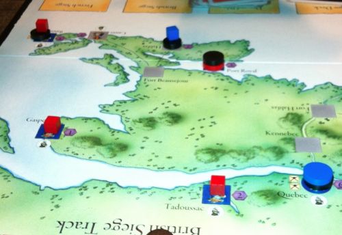 Une fois Port Royal tombé, la priorité est à la fortification de Louisbourg et de Quebec. Un achat d'une seconde fortification est nécessaire. Mais Louisbourg est assiégée assez rapidement. Le Deck, très militaire de l'anglais tourne vite, et il peut donc enchaîner les sièges. La résistance du français est molle, ses deux infanteries régulières ne répondant pas à l'appel, le soutien de la mère patrie non plus. Louisbourg, bien que fortifiée, tombe également. Le français est sous pression : Quebec, toujours pas fortifié, est sous la menace d'un raid. Le français est désormais un peu en retard à cause des pertes, et Quebec risque de tomber. Malheureusement la fortification n'est toujours pas disponible, mais heureusement l'infanterie régulière et le home support sont désormais prêts (c'étaient les 3 dernière cartes du deck !). Lorsque l'anglais lance le siège, la réplique du français est donc violente et le siège tourne court à l'avantage du français. Un premier tournant de la partie ?