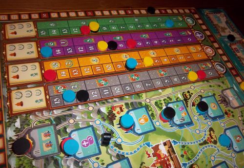 Je suis trop content, vous pouvez pas savoir ! Je suis parti assez rapidement sur les cartes oranges et je vais finir en haut de cette piste. Je suis premier aussi sur la piste verte, objectif que je visais dés le départ. Je fini par contre bon dernier sur la piste des voyages et des gardes. je marque également 14 points sur le diplômes. Mon adversaire le plus dangereux à lui joué sur les voyages et va monter son jeton au sommet de cette piste, il termine aussi premier sur les gardes.