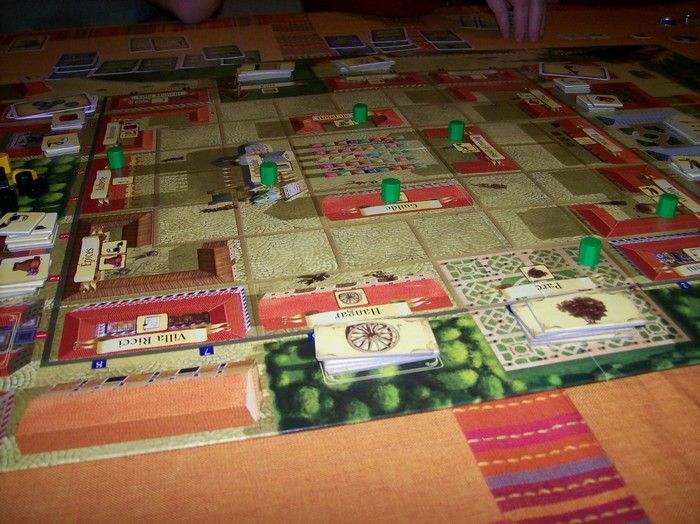 Nous négocions pour le déplacement mais sans obtenir pour autant l'action du bâtiment. Il fallait ensuite jouer les bâtiments dans l'ordre. Le joueur dont c'était le tour prenait l'action ou nous la proposais aux enchères (que nous avons joué en 1 tour). Si personne ne la prenait et que le premier joueur n'avait pas encore pris d'action, il la prenait alors.LA limitation à une action a été jouée, elle. Ca obligeait à bien réfléchir sur les déplacements et limitait le négoce.
