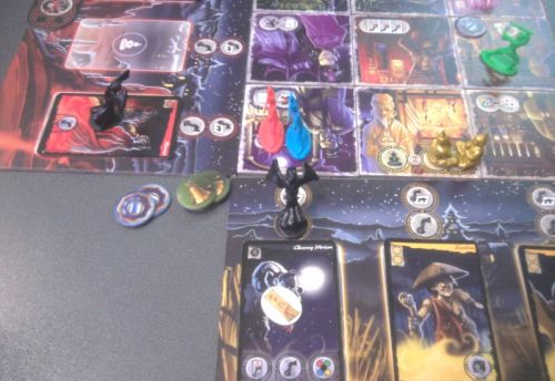 Lorsque Wu-Feng est le prochain fantôme à arriver, nous sommes déjà aux abois. Chacun d'entre nous n'a plus qu'un Qi et il ne reste qu'un seul Yin-Yang disponible. Et bien évidemment nous avons peu de jetons Tao. Cependant, c'est Death Army le grand méchant, et nous n'avons qu'un seul Tao noir pour l'abattre (il a 5 de force) pour le moment. Mais le gros problème, c'est que nous avons beaucoup de fantômes en jeu et que nos plateaux sont bondés. Nous ne pouvons combattre Wu-Feng dans l'immédiat et pourtant le temps presse. Mon plateau est envahi de 2 hanteurs et d'un 3ème fantôme plus anodin. Une tuile est d'ores et déjà hantée donc si mes 2 fantômes hantent à leur tour, nous perdons. Malheureusement, un exorcisme raté scelle le destin du taoïste vert dont le plateau était blindé. Puis ce fut le tour du taoïste bleu dans les mêmes conditions, et enfin celui du jaune. Le rouge a pu survivre un tour, mais lorsqu'il a fallu gérer les autres plateaux, il est bien entendu tombé lui aussi.