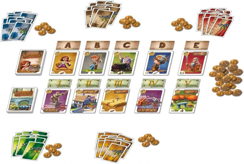 Vous achèterez des cartes Personnages et des cartes Bâtiments depuis un marché central afin de réaliser des collections de ressources. Certaines cartes Personnages/Bâtiments couteront 0, et vous apporteront 1 ressource (par exemple 1 cervoise). D'autres cartes vous couteront 1 pièces, ou 2 ou même 3, et vous apporteront par exemple 2 glaives ou encore un point de victoire par pain en fin de partie.