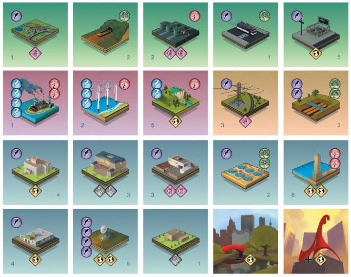 Les emplacements ainsi que les tuiles pour les y mettre ont des couleurs précises qu'il faut respecter : un bâtiment se met sur un emplacement de même couleur. Si vous le placez sur un emplacement d'une autre couleur, vous perdez certains bénéfices ou allez avoir un malus.