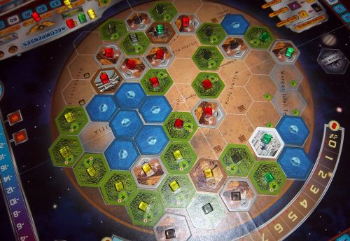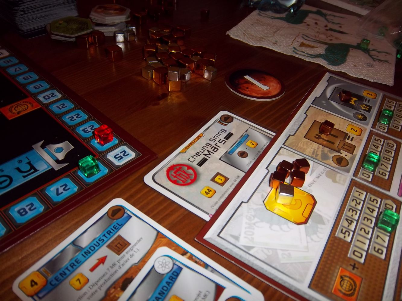 Parties vraiment intéressante avec un scénario qui a vu les tuiles océans rapidement installées sur le plateau (nous avons joué avec le coté Hellas, plateau de la seconde extension).
