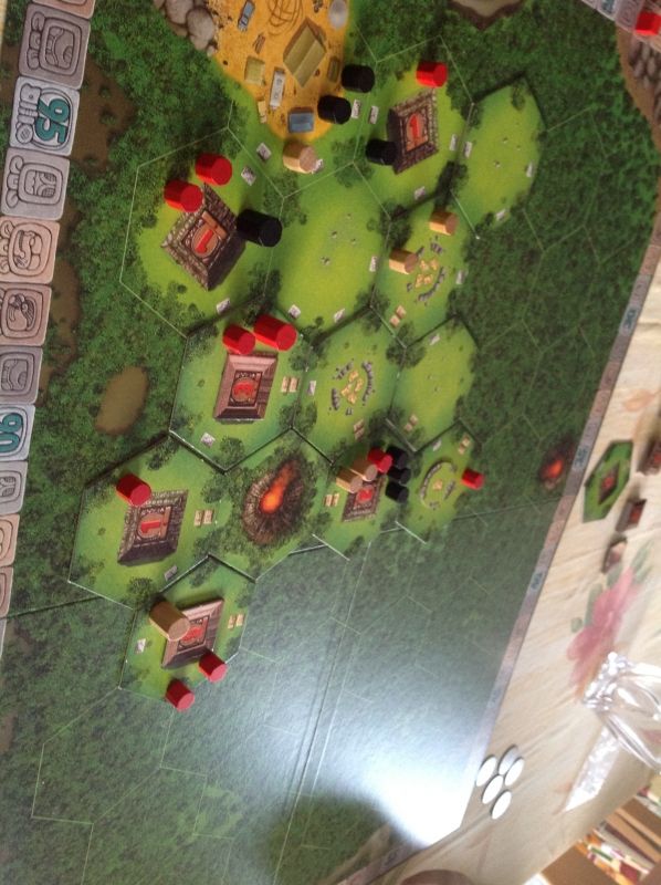 Après évolution du terrain, arrivent nos premières tentes et quelques temples puis arrive le nouveau volcan en ma défaveur loin des temples qui rapportent alors que mes adversaires sont privilégiés mais c'est sans compter sur mes deux séries de 3 trésors plus mes deux arts qui ne demandent qu'à trouver leurs petits frères que possède JP ce qui tombe bien.